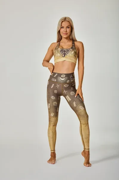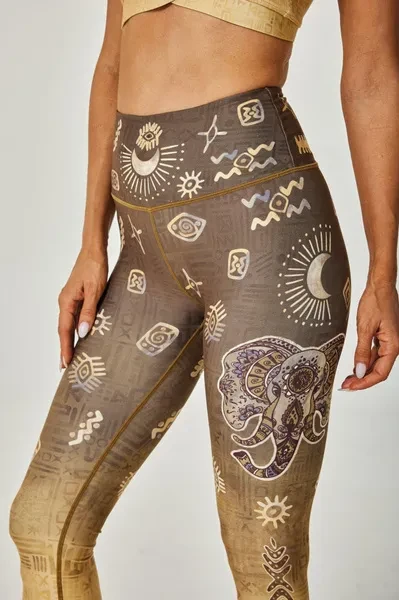 Pattern Description: Inspired by the ancient culture, the print beautifully depicts an array of ancient and mystical symbols including 'water,' 'sun,' 'eye,' 'moon,' and 'stars,' seamlessly intertwined with ancient elephants elements. Set against a gradient background of rich golden hues with a nostalgic feel, this design becomes the top choice for yoga and meditation enthusiasts. It encapsulates a profound sense of connection with the past and a timeless, spiritual essence, making it a meaningful choice for those seeking deeper mindfulness and tranquility in their practice. Product Features: High-waisted design perfectly shapes, supports and flatters any body types No small elastic band at the top A hidden pocket at the back No side seams for extra flattering fit and comfort Pair it with our matching Aureus Bra for a totally unique and dreamy look Fabric: Made with 84% RPET and 16% spandex from recycled plastic bottles and it is 100% recyclable! - Four-way stretch, breathable and anti-bacterial. Model Info: Natali// Height: 5'7// Bust 34.3” // Waist 24.4” // Hips 36.6//SILVERWIND size Regular S Poli//Height: 5'7 // Bust 33.5” // Waist 23.6” // Hips 35” //SILVERWIND size Regular S