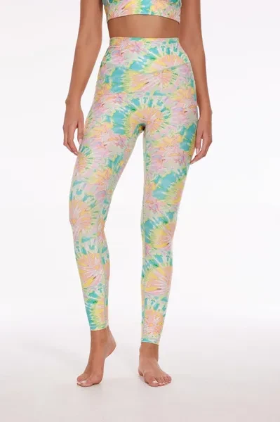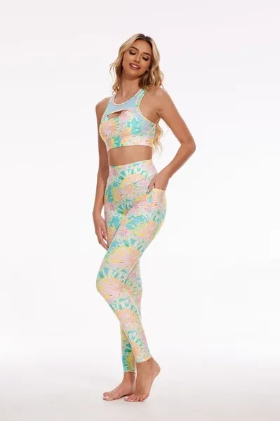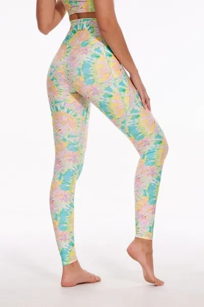 Pattern Description: Inspired by tie-dye art, this pattern seamlessly blends traditional tie-dye with a modern aesthetic. The primary hues are pink, yellow, and green, interwoven together with shades of blue and white, resulting in a vibrant yet harmonious overall palette. The pattern's lines are curved and fluid, forming freely blooming flower shapes, showcasing a rich sense of depth and abstract beauty. The bright and vivid pattern illuminates your everyday workout, making you stand out in the crowd.  Product Features: High-waisted design perfectly shapes, supports and flatters any body types. No small elastic band at the top. Two side pockets for essentials. No side seams for extra flattering fit and comfort. Stretchy and light fabric for a smoothing, second-skin feel. Fabric: Made with 84% RPET and 16% spandex from recycled plastic bottles and it is 100% recyclable! - Four-way stretch, breathable and anti-bacterial.