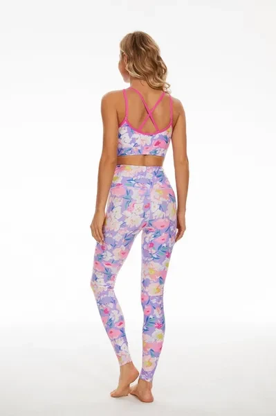 Set against a backdrop of purple and pink hues, our designer used the abstract artistry of watercolor to portray an array of beautiful flowers. It's a vivid symbol of feminine confidence, beauty, and charm, offering a perfect blend of romance and vivacity. As you move through your yoga sequences or workout routines, this design not only enhances the aesthetic appeal of your attire but also energizes your fitness journey with its lively and romantic atmosphere.