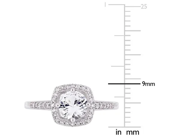 This stunning halo ring is crafted in lustrous 10-karat white gold and features a stunning 1.00 carat lab created white sapphire at the centre and dazzling diamonds in a halo and halfway along the band. Enhanced with a striking finish this ring will make her gleam with happiness. Pair this ring with any ensemble for a polished look.