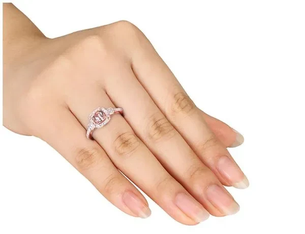 A pink Morganite gem glows from the center of this splendid square halo ring. Glittering white diamonds cascade down the 10 karat rose gold band, bringing the total gem weight to a glamorous 0.80 carats (ctw).