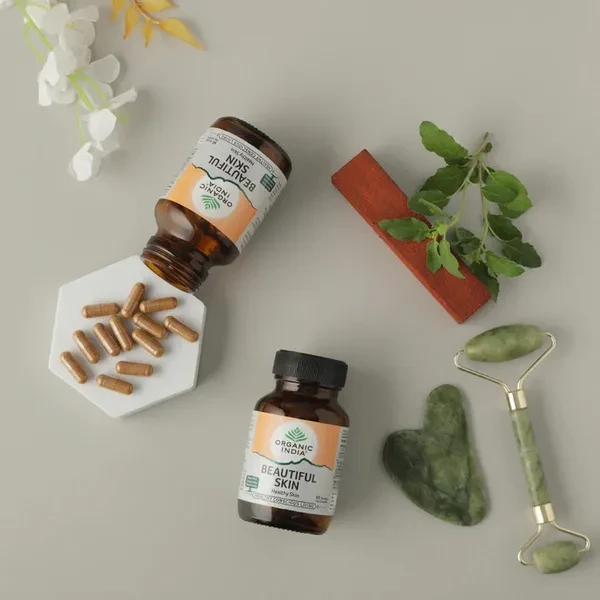 A TATA Product - Organic India Beautiful Skin Capsules - 60 Veg Caps, For Healthy, Radiant & Glow, Helps Rejuvenate Skin & Naturally Purify The Blood, GMP & NPOP Certified Organic