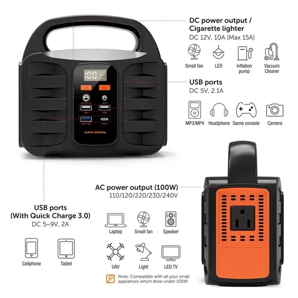 Features Points 1. On-the-go Generator: It offers 155Wh (42000mAh) of power capacity, provides power for laptops, camera batteries, TVs, fans, CPAP machines (working time depends on its output power) and other small appliances. Built-in LED Flashlight with SOS mode. Integrated Digital display for charge and discharge and battery life status. 2. Multi-Output and Rapid Charging: 4 USB charging ports (2* Quick Charge 3.0 USB port, 2* 2.1A USB ports) detect your devices to deliver its safest maximum charge speed up to 3A. Featured with 1 AC power outlets (110V/100W) for optimal versatility. Simultaneously power up to 6 devices. 3. Recharge in 3 ways easily: This power station can be recharged through an AC outlet using the included AC adapter, Charge from solar panel (Solar Panel not included), or Charge from your car with a 12V cigarette lighter. On the wall, you can recharge the power supply by AC outlet. When driving, recharging is super-easy by 12V cigarette lighter for 11 hours. And built-in MPPT helps it recharged under sun with solar panel. 4. Multi-Safety protections: Safety Protection including Over charge protection, Over Release Protection, Over Current Protection, Short Circuit Protection, Over Power Protection, Over Temperature Protection. 5. Portable & Compact: Super slim size (7.32 x 7.09 x 4.21 inches) and lightweight (3.42lbs). The portable power station with a compact handle design is not only for emergency backup power at home, but also for camping or wherever you need power when you are on the go. Product Description: Alpha Digital’s T101 is a portable high-capacity Power Station. The portable power generator supports solar charging function, allowing you to replenish energy at any time during outdoor camping and travel. The compact size can provide 155Wh/42000mAh of power. Convenient 3 ways of recharging (solar panel, wall charger, car charge) can get juice back easily. AC is suitable for small electrical appliances below 100w, and is a good partner for outdoor camping, and can also be used as an emergency backup power supply. ALPHA DIGITAL T101 Portable Power Station Input: ●Way 1: Charged by wall outlet (DC 15V/2A) ●Way 2: Charged by solar panel (DC 13~22V/2A Max) ●Way 3: Charged by car charger Output: ●1* DC Output: 9~12.5V/10A(15A Max) ●1* AC Output: 110~240V 50/60Hz ●2* USB Output: 5V/2.1A Max ●1* USB QC3.0 output: 5-9V/2A ●1* USB C QC3.0 output: 5~9V/2A On-the-go Generator It offers 155WH (42000mAh) of power capacity, provides power for mobile phone, tablet, laptops, light camera batteries, TVs, fans, CPAP machines and more at anytime. (working time depends on its output power) LCD display screen Multifunctional LCD display will show you the remaining energies/charge/discharge/AC output/DC output status. Ultra bright LCD screen let you know the statue of battery pack even no light source camping. Super Bright LED Light 4W Ultra bright LED light With Steady/Strobe/SOS mode, 3 LED modes for camping and emergency. Lighting at night and emergency work are perfect. Recharged by ac wall charger Plug it into the wall charger can be fully recharged about 7~8 hours. Recharged by cigarette lighter adapter Recharge from your 12V car charger about 11 hours. Recharged by solar panel Fully charged under the straight full sun around 11 hours when connected (recharging time varies from a different location, temperature, weather, etc.) (solar panels not included, recommend to choose 18V/35W~ 40W solar panels). Safety protection ●Over charge protection / Over Release Protection ●Over Current Protection / Short Circuit Protection ●Over Power Protection / Over Temperature Protection Specifications ●Capacity: 155Wh/42000mAh ●Dimensions(L*W*H): 186x107x180mm ●Weight: 1. 55Kg ●Built-in Battery: High Quality Lithium ion Batteries ●Input Recharging : Adapter: DC15V/2A ●Solar Panel Charging: DC 13V~22V/2A Max ●Fully Charged Time: DC15V/2A: 7~8 hours ●DC Output: 5.5 x 2.5MM DC Output: 9~12.5V/10A(15A Max) ●USB Output: 2 x USB 5V/2.1A Max ●1 x USB C 5-9V/2A QC3.0 ●1 x USB 5~9V/2A QC3.0 ●AC Output: 10/120/220/230/240V 50/60Hz ●AC Power: AC Continuous Output: 100W (150W Max) ●Bulb Type: 4W Ultra bright LED light With SOS/ Blink mode ●Power Indicator: Led Display ●Operation temperature: -10°C-40°C ●Lifecycle: >500 times What’s-In-The Box? ● 1 x Portable Power Supply ● 1 x 15V/2A Power Adapter ● 1 x Car Charger ● 1 x Cigarette Lighter Adapter ● 1 x User manual ● 1 x Quick Start Guide ● 1 x Warranty Card