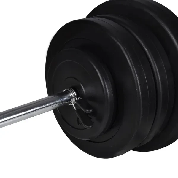 This set of ergonomically designed barbell/dumbbell set will allow you to perform a large range of exercises more easily and safely at home or in the gym. The set includes 1 barbell, 2 dumbbells, and 16 weight discs. The barbell/dumbbell set features solid chrome-plated bars with quick-action spring collars (barbell bar), non-slip grips, and fluted star-screw caps (dumb bell bar) for secure attachment of the weight discs. You can work out without worrying about safety issues. The weight discs are made with a robust PE casing. They can be combined in various ways for different training purposes. Delivery includes 1x barbell bar, 2x dumbbell bars, 6x 1.25 kg weight discs, 4x 2.5 kg weight discs, 4x 5 kg weight discs, 2x 10 kg weight discs, and 6x caps. Gripsize: approx. 14.5cm(barbell),10 cm(dumbbell) Weight Disc: Polyethylene casting Barbell bar: Ø2.5cm,length140cm, 2kg Dumbbell bar: Ø2.5cm,45cmlength, 0.5 kg 1.25kgweightdisc: Ø 17.5cm,3cmthick 2.5kgweightdisc: Ø 22 cm,4cmthick 5kgweightdisc: Ø 27cm,4.5cmthick 10kgweightdisc: Ø32cm,5.5cmthick Total weight including bars: 60.5 kg Total weight of discs: 57.5 kg