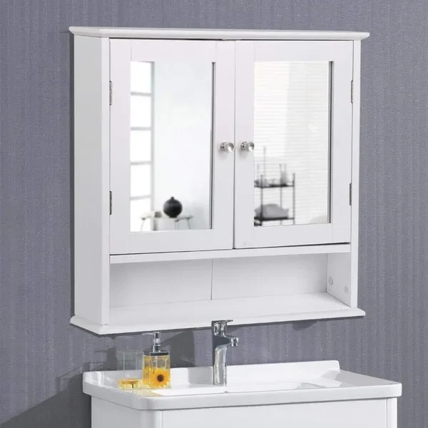 Introductions: If you are looking for a cabinet to store your cutter, this Double Door Mirror Indoor Bathroom Wall Mounted Cabinet Shelf must be a good choice for you. It's fantastic for the bathroom or in any other room where you require some additional storage. Adopting high quality MDF material, it features smooth, stable and sturdy. With a mirror design, it's very convenient for use. Moreover, it's wall-mounted, which is space saving. With high quality and fine workmanship, it's worth buying! So don't hesitate, just take it home! Features 1. Made of high quality material, smooth, sturdy and durable 2. Waterproof, suitable for humid environment 3. It has a long service life 4. Wall-mounted, save space 5. Add some additional storage for you 6. Magnetic lock to hold doors shut 7. Convenient for use Specifications: 1. Material: MDF 2. Color: White 3. Dimensions: (22 x 5.1 x 22.8)" / (56 x 13 x 58)cm (L x W x H) 4. Weight: 13.23 lbs / 6 kg Package Includes: 1 x Double Mirror Bathroom Cabinet 1 x Manual