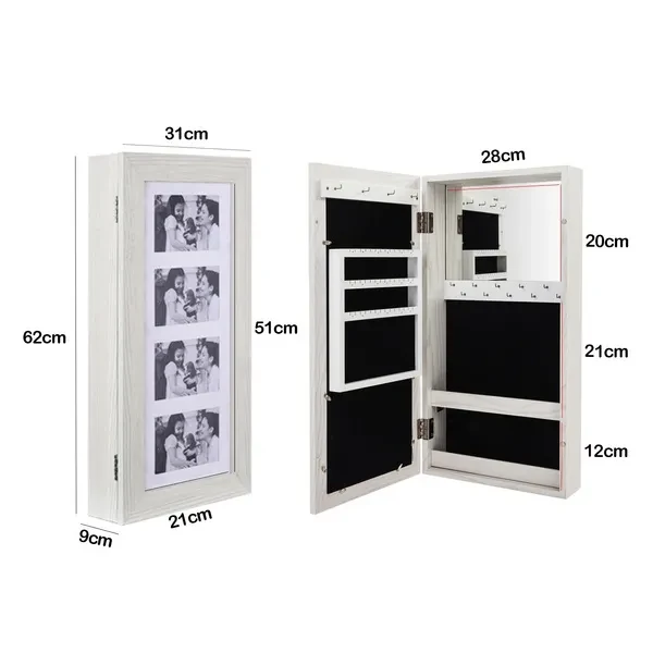 Introductions: Here we are highly recommended this Simple PVC Wood Grain Coating Photo Storage Damp-proof Jewelry Mirror Cabinet to you. It becomes a necessary beauty tool. Made up with durable and reliable material, it can be used for a long time! It not only can be used as a mirror, but also is a useful storage rack! All of the internal space has a villous render; it feels soft and comfortable, and not easy to damage the ornament place in it! You can't miss it anymore! Features: 1. It has a spare mirror inside 2. All of the internal space has a villous render; it feels soft and comfortable, and not easy to damage the ornament place in it 3. The mirror is smooth and real, without distorting mirror effect 4. Solid plate base design, security and firm 5. Large space, with all kinds of hook, meet all your place demands. 32 ring slots, 4pcs hooks and 3 rows earrings shelf with 14 screens 6. Especially space designed for storing photos 7. A complimentary key firmly lock the precious items. To ensure the safety of your property 8. Perfect decorates bedroom and sitting room Specifications: 1. Material: High Density Board & Glass Mirror & Velvet Lining 2. Color: White 3. Cabinet Dimensions: (11.81 x 3.54 x 23.62)" / (30 x 9 x 60)cm (L x W x H) 4. Net Weight: 7.94 Lbs / 3.6 kg Package Includes: 1 x Jewelry Cabinet 1 x Accessories Package 1 x Instructions