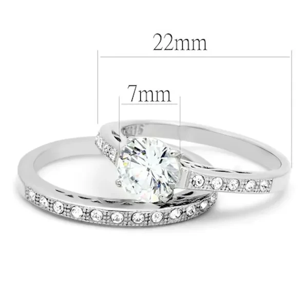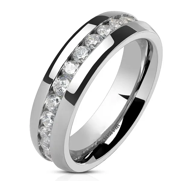Women's Ring This women's 2 piece AAA grade cubic Zirconia wedding set is Amazing! Made of solid surgical stainless steel with no plating and a high polished finish. This engagement ring showcases a 1.28 ct (7mm) round cut center stone accented by 10 (1mm) round pave set side stones. Matching wedding band has 12 (1mm) round cut stones in a pave setting. The total approximate diamond equivalent weight is 1.39 carat. Our stones are made of the highest quality, is cut to perfection and display amazing clarity, just like real diamonds! Stainless steel 316 jewelry is very durable, will never oxidize and is hypo-allergenic. Men's Ring 6mm or 8mm wide unisex AAA grade cubic zirconia comfort fit eternity wedding band. Made of solid surgical grade stainless steel with no plating and a high polished finish. This band showcases approximately 30 (2mm) round brilliant cut stones in a channel setting. The total approximate diamond equivalent weight is .90 carat. Our stones are made of the highest quality, is cut to perfection and display amazing clarity, just like real diamonds! Stainless steel 316 jewelry is very durable, will never oxidize and is hypo-allergenic. Includes Gift Box Set for Giving or Storage. All rings are U.S.A size rings. Please look at photo of chart for the equivalent international sizes. IF YOU ARE NOT SURE OF YOUR SIZE. YOU CAN MEASURE YOUR RING SIZE AT WWW.FINDMYRINGSIZE.COM Ring Sizes USA Size 5 = about 16mm diameter USA Size 6 = about 16.5mm diameter USA Size 7 = about 17.5mm diameter USA Size 8 = about 18mm diameter USA Size 9 = about 19mm diameter USA Size 10 = about 20mm diameter USA Size 11 = about 20.5mm diameter USA Size 12 = about 21.5mm diameter USA size 13 = about 22.5mm diameter USA Size 14 = about 23.5mm diameter