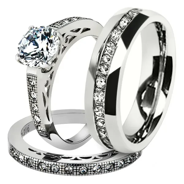 His & Hers Stainless Steel 1.39 Ct Cz Bridal Set & Men's Eternity Wedding Band