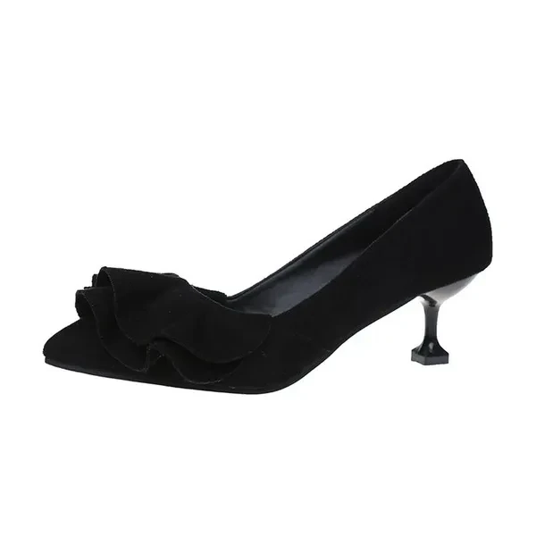 Fashion Women Kitten Heels Pointed Toe Pumps Slip on High Heels Woman Elegant Ruffles Shoes 5Color color black hot pink red khaki pink heels high 5cm suede leather size chart US SIZE 4.5 5.5 6.5 7 8 cn 35=us 4.5=EU 35=UK 2=foot length 8.5'=21.6cm cn 36=us 5.5=EU 36=UK 3=foot length 8.875'=22.5cm cn 37=us 6.5=EU 37=UK 4=foot length 9.0625'=23cm cn 38=us7=EU 38=UK 5=foot length 9.5'=23.8cm cn 39=us 8=EU 38.5=UK 5.5=foot length 9.5'=24.1cm